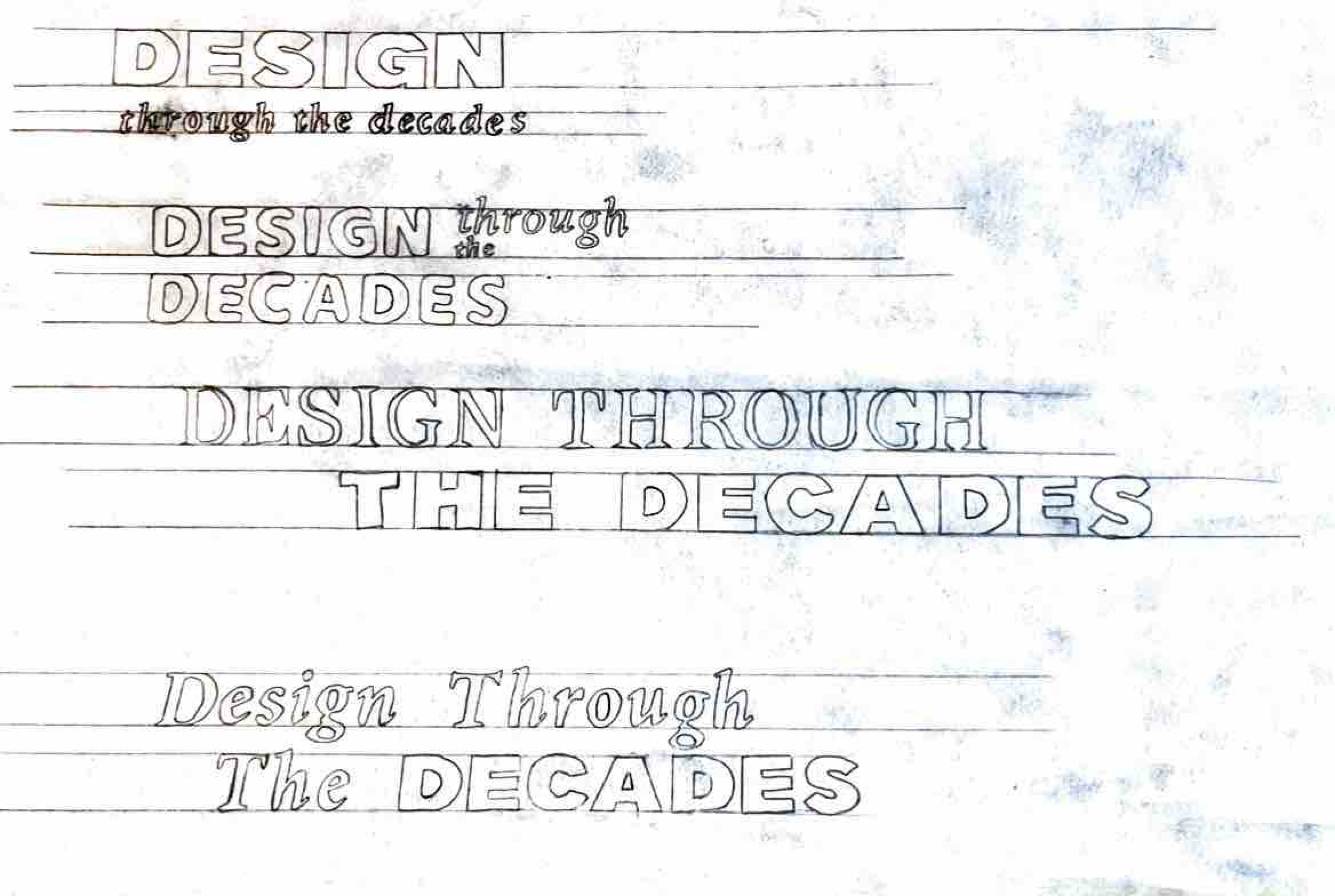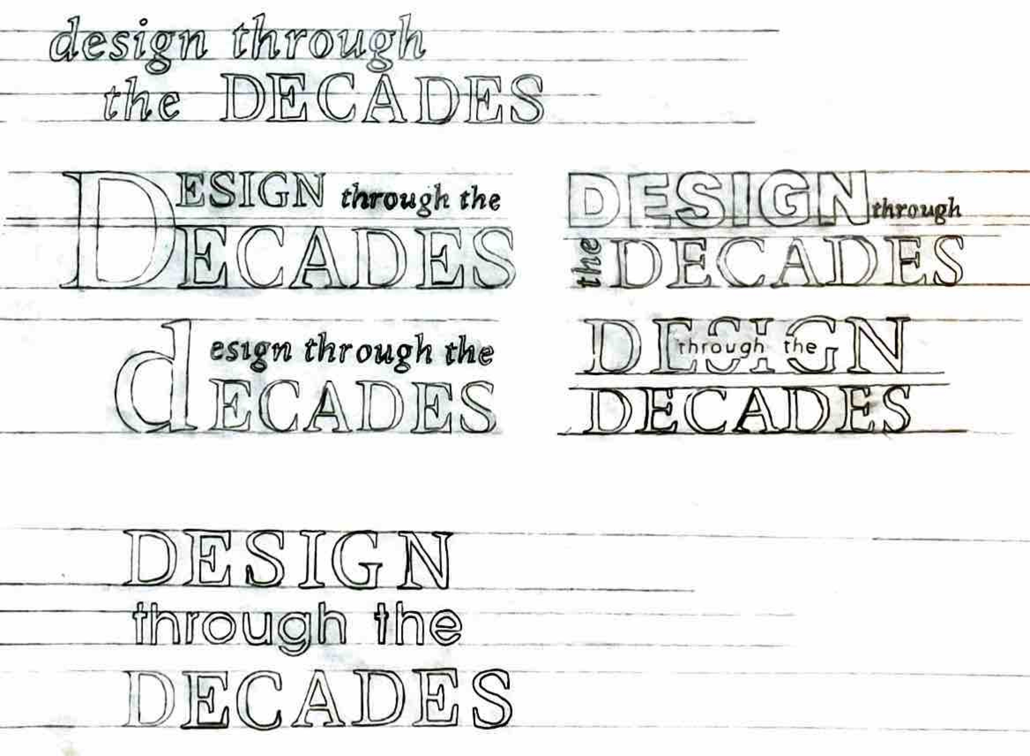 For the Design Through the Decades magazine, I created a custom logo that reflects the publication’s mix of history, typography, and modern design. I began by sketching 10 different logo concepts on tracing paper, experimenting with various typefaces, lettering styles, and compositions to explore a wide range of visual directions.