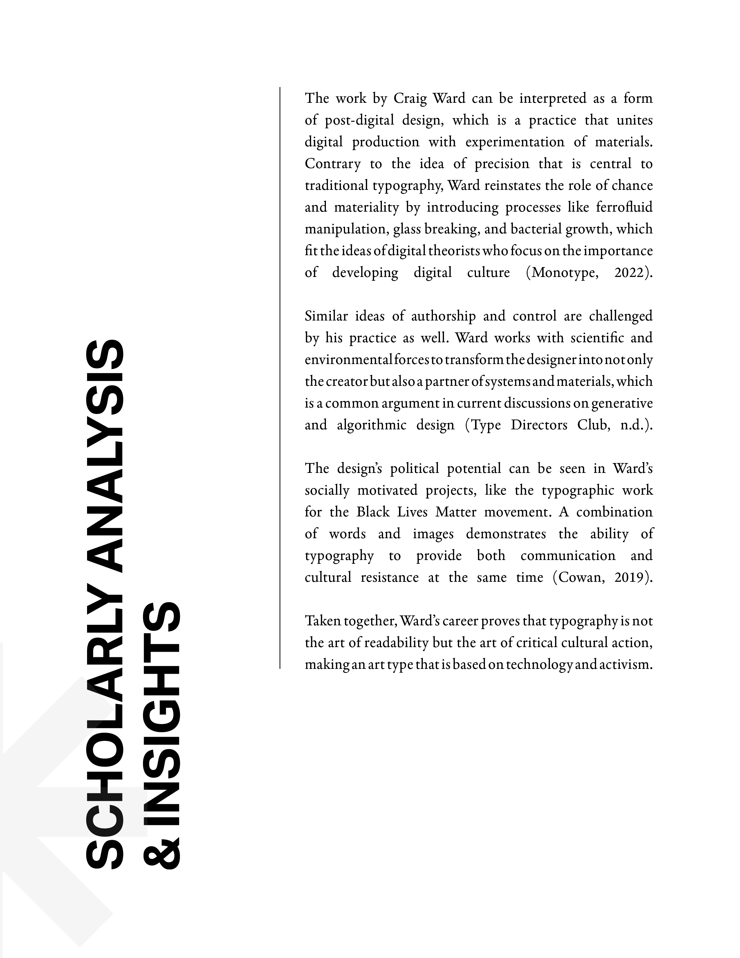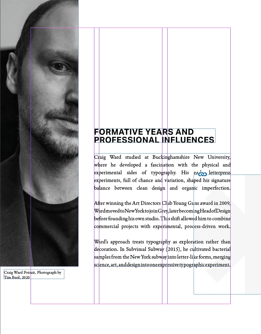I began with extensive research and content organization, gathering verified information about Craig Ward’s life, projects, and design methods. Next, I developed moodboards and sketches to explore layout options inspired by Ward’s bold, text-based compositions.