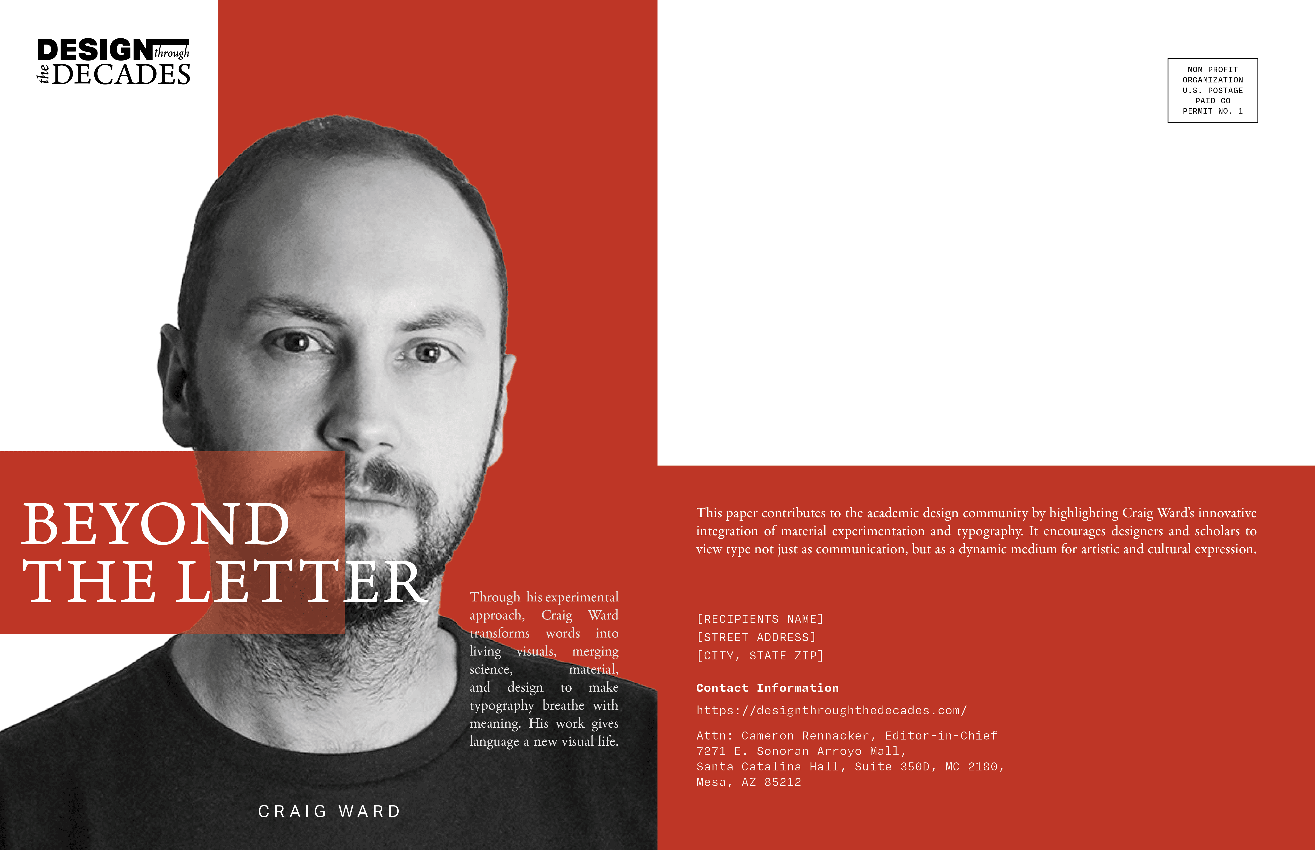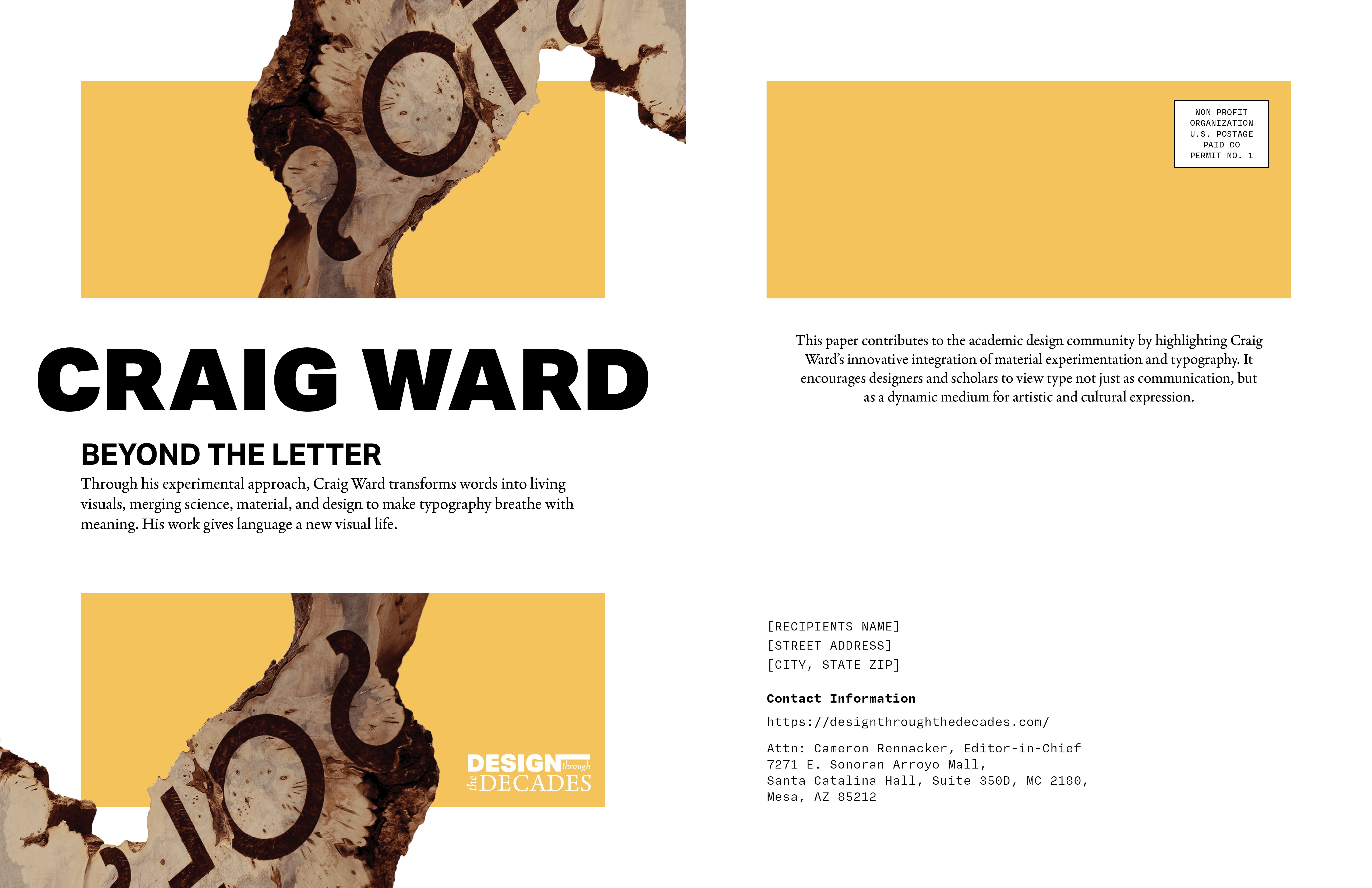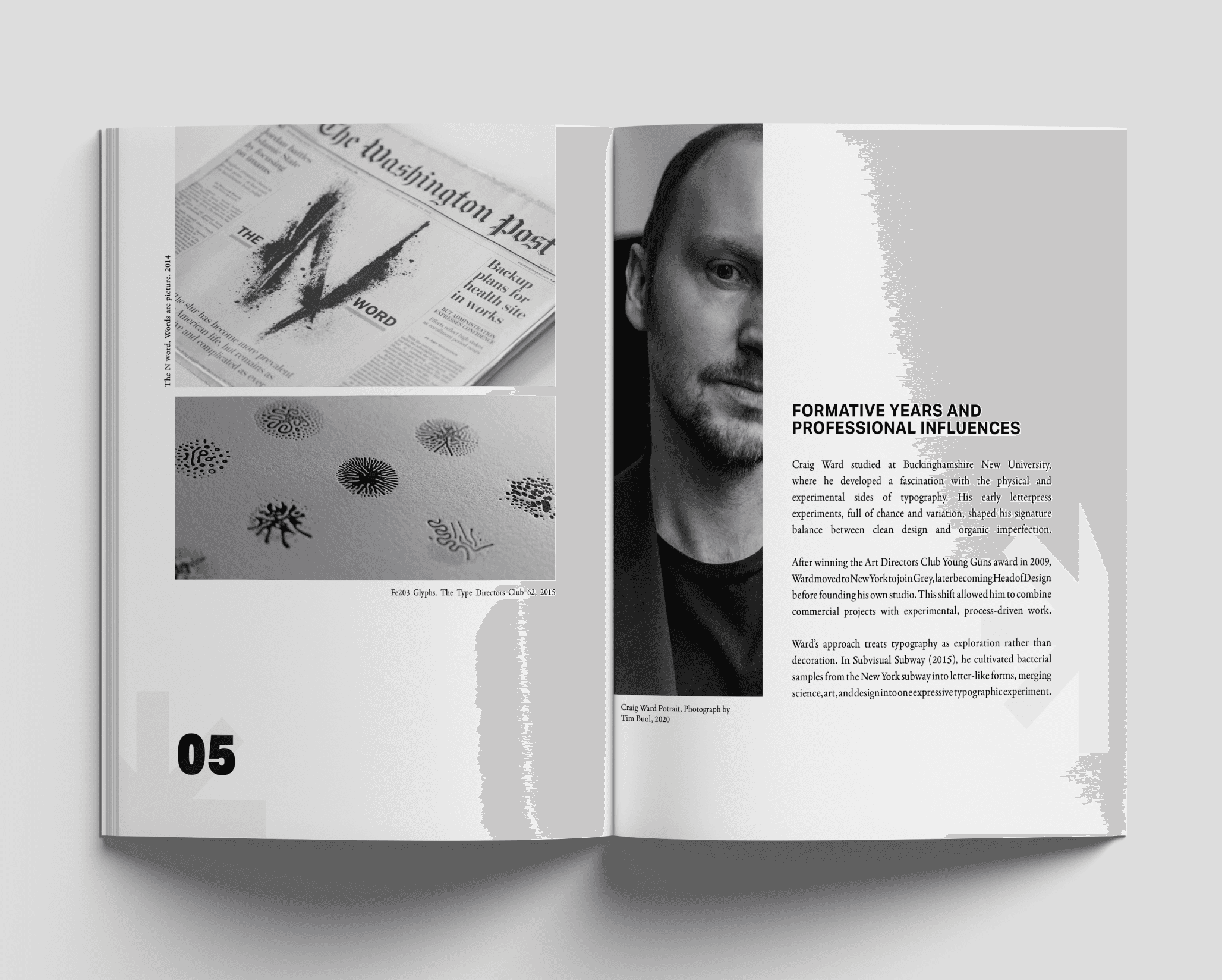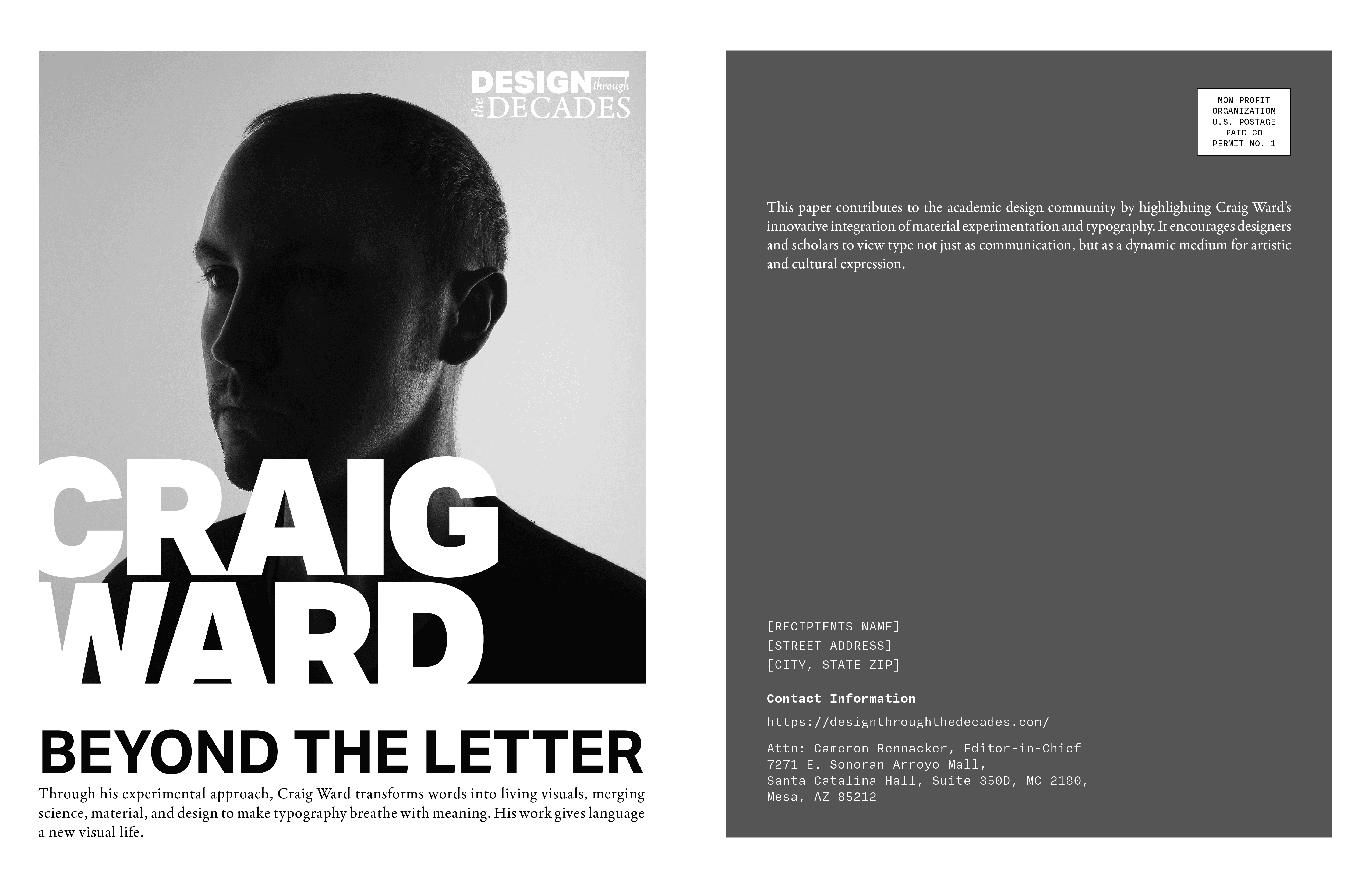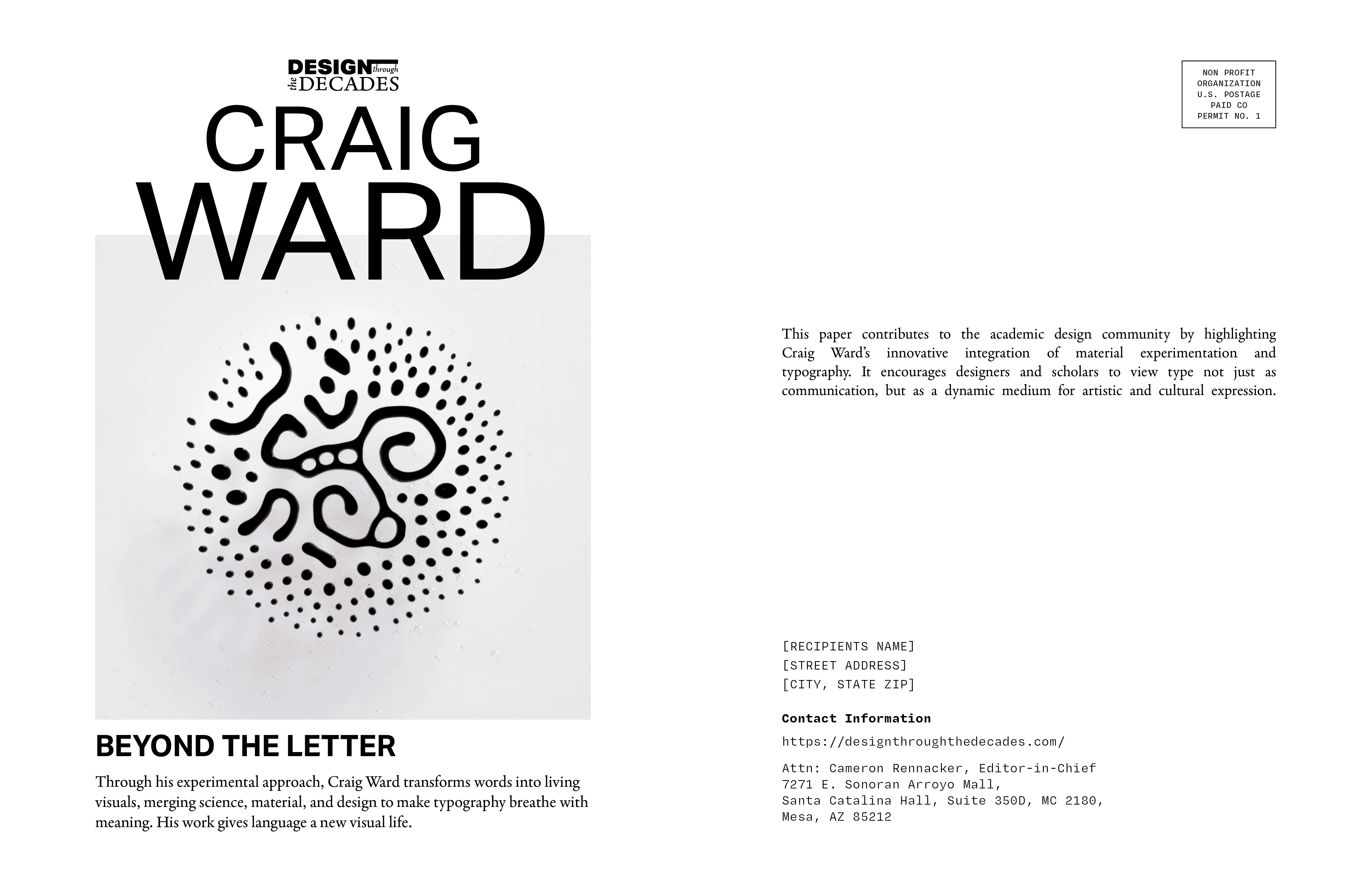 For this project, I designed a condensed magazine for the Design Through The Decades journal, featuring my article on Craig Ward, a New York–based designer known for his experimental and artistic approach to typography. Ward transforms words into visual art, blending science, materials, and design to make type expressive and meaningful.