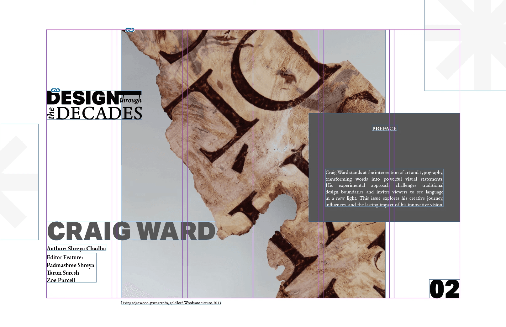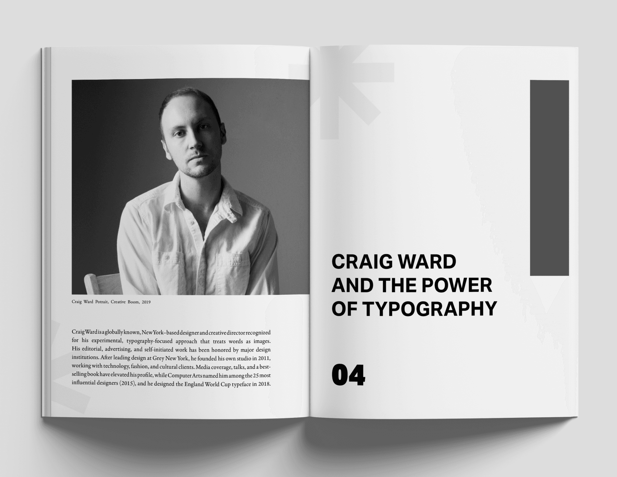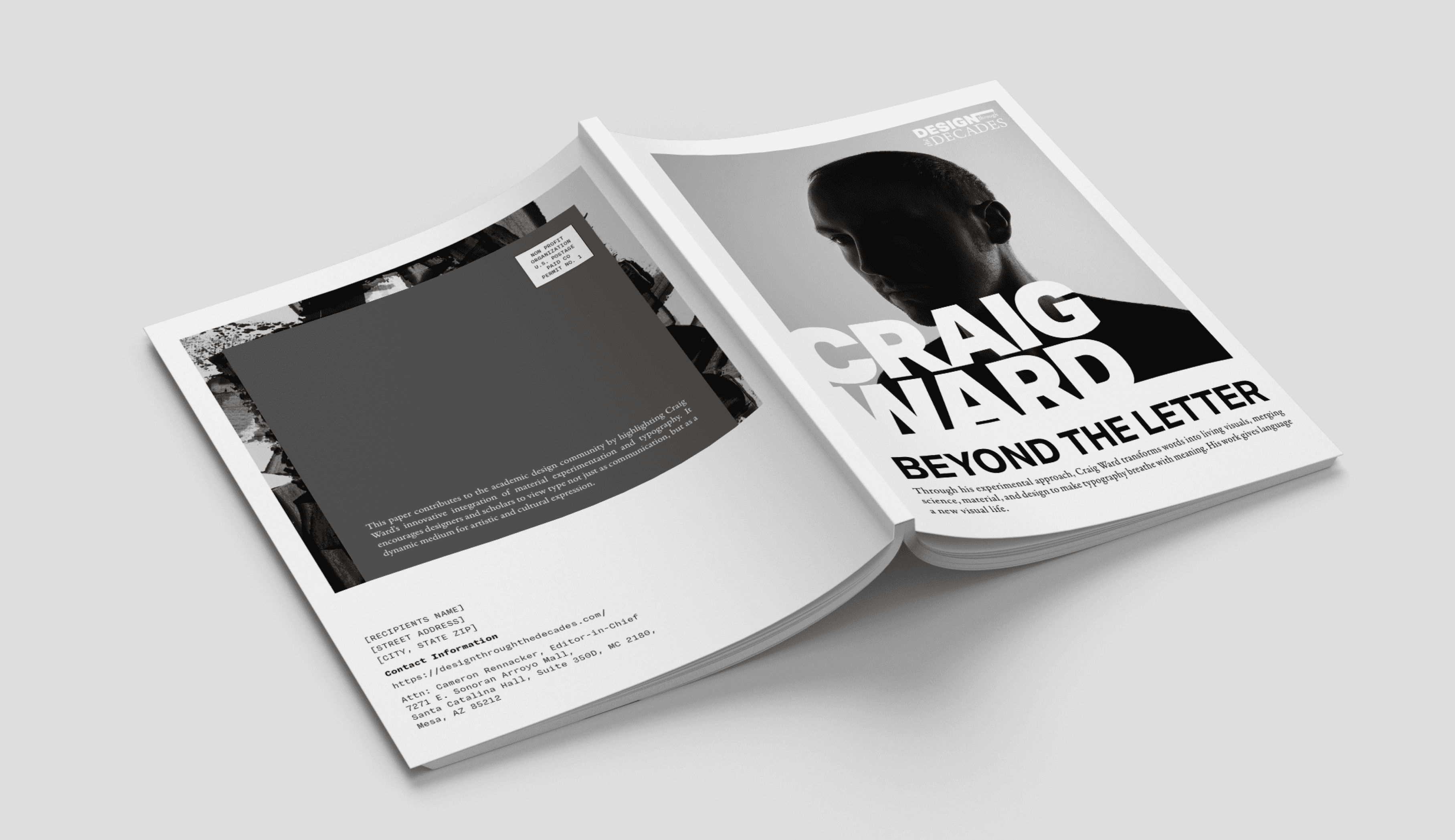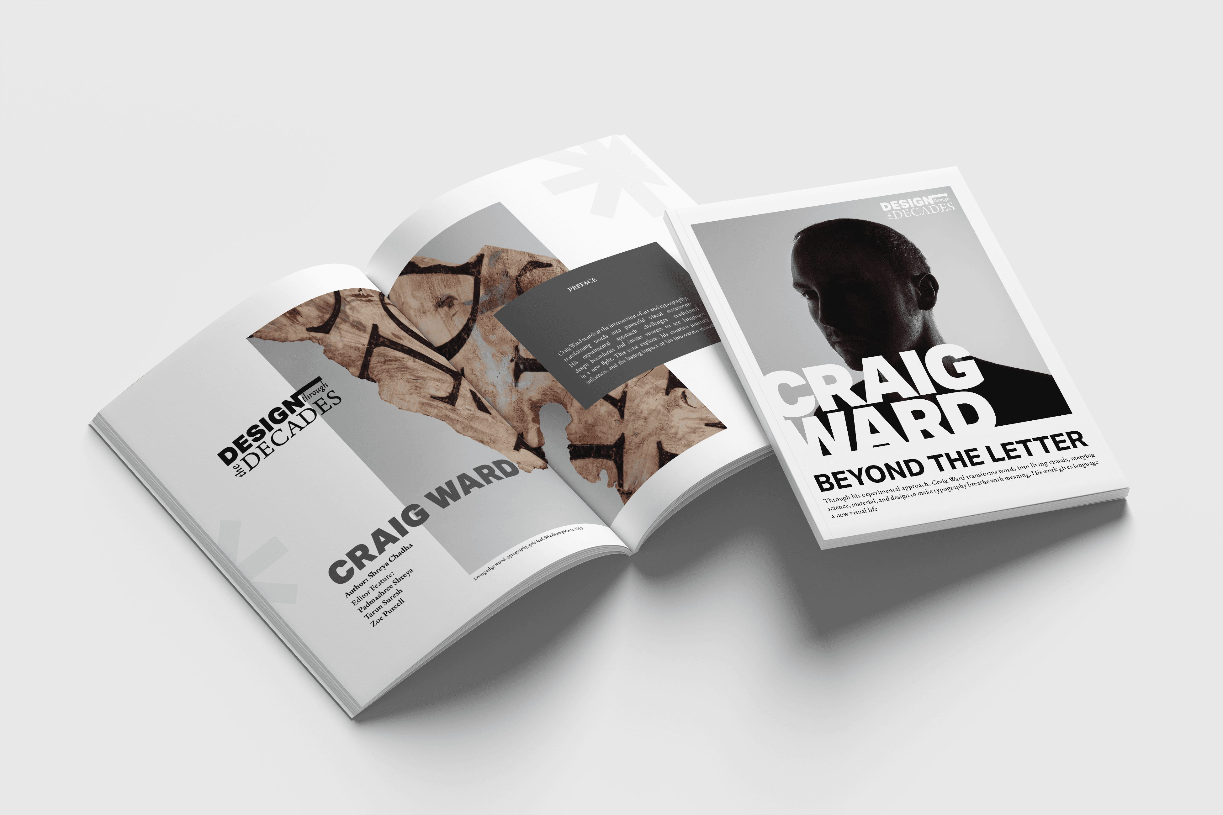 A magazine design created in Adobe InDesign for the Design Through The Decades journal, featuring typographer Craig Ward. The project blends research, layout, and typography to reflect his experimental approach to design.